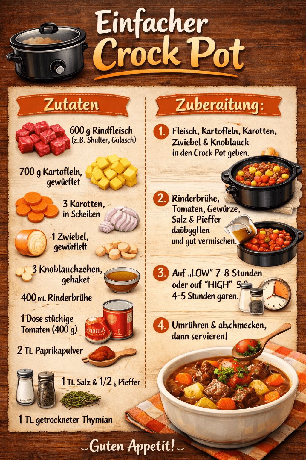 Ein einfacher Crock Pot, ein Crock-Pot (Slow Cooker) ist ein elektrischer Topf, mit dem du Essen über mehrere Stunden langsam garst – perfekt für einfache, stressfreie Gerichte 👍