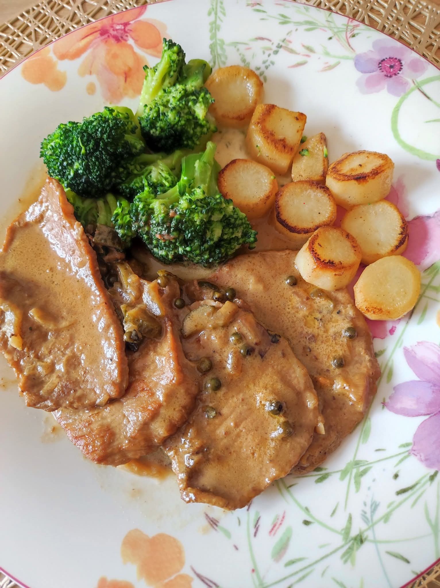 🥩 Minutensteaks im Obers-Pefferkörnersafr, dazu Petersilienwurzel und Brokkoli