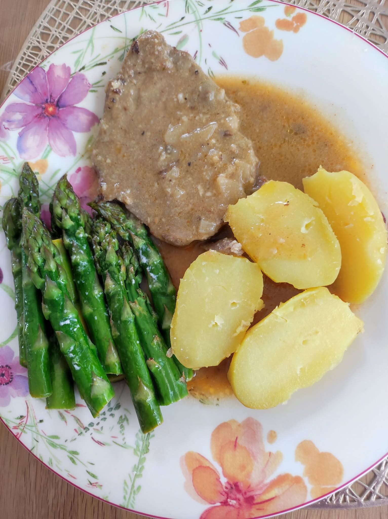 Das klingt nach einem herzhaften, typisch österreichisch-deftigen Gericht, ich formuliere dir das einmal sauber als Rezept, damit du es nachkochen kannst Schweinschopf im Zwiebel-Knoblauchsaft mit Kartoffeln und Spargel: