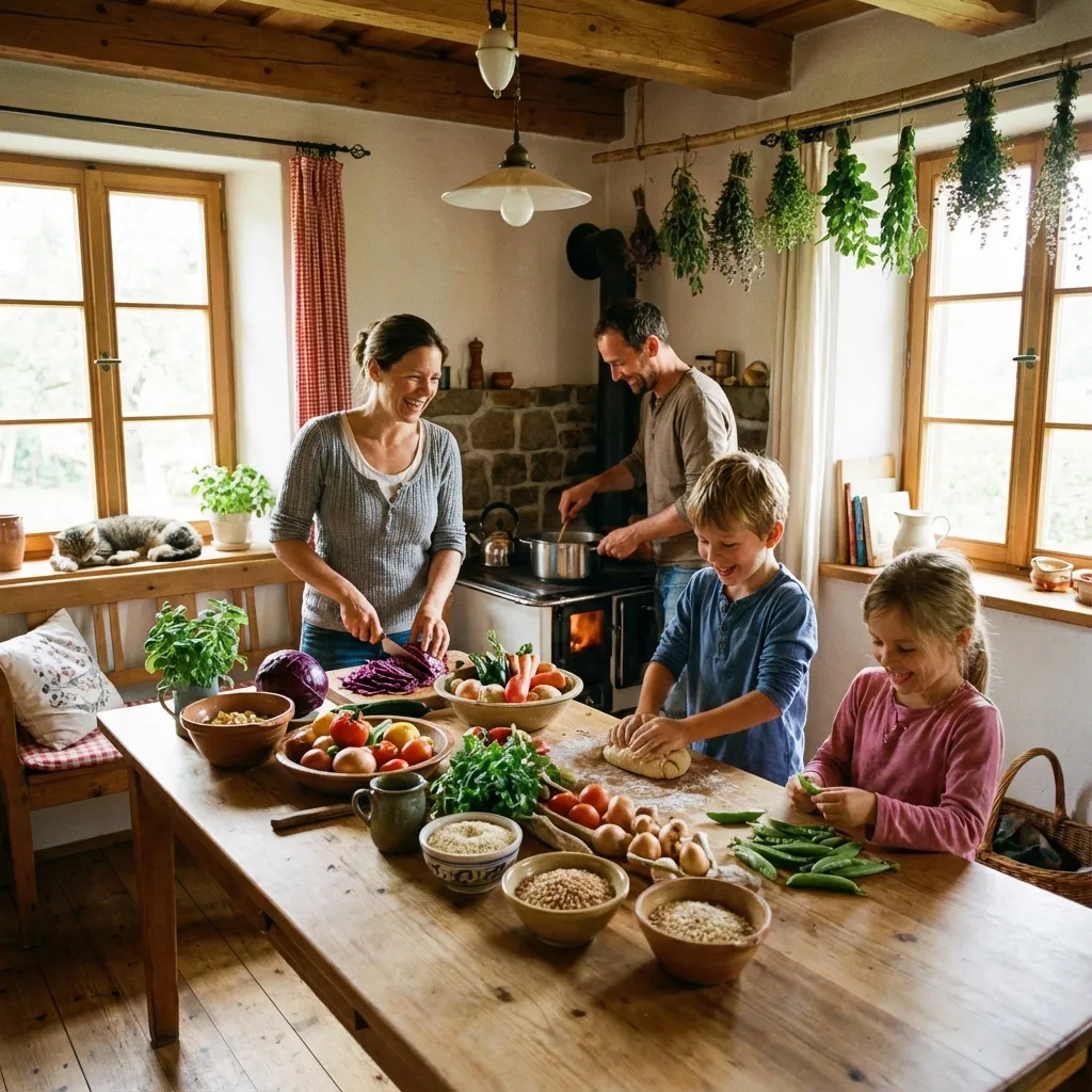 Eine gemütliche, gut beleuchtete Familienküchenszene in einem rustikalen deutschen Haus, in der 4 Personen (zwei Erwachsene, zwei Kinder) gemeinsam eine farbenfrohe, gesunde Mahlzeit mit frischem Gemüse, Getreide und Kräutern an einem Holztisch zubereiten, warmes natürliches Licht strömt durch das Fenster, lebendige Farben, realistischer Stil.