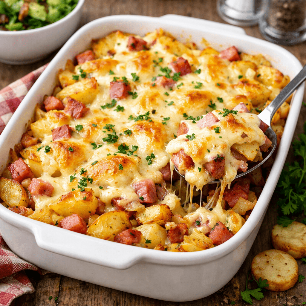 Käsiger Schinken und Bratkartoffel Auflauf
