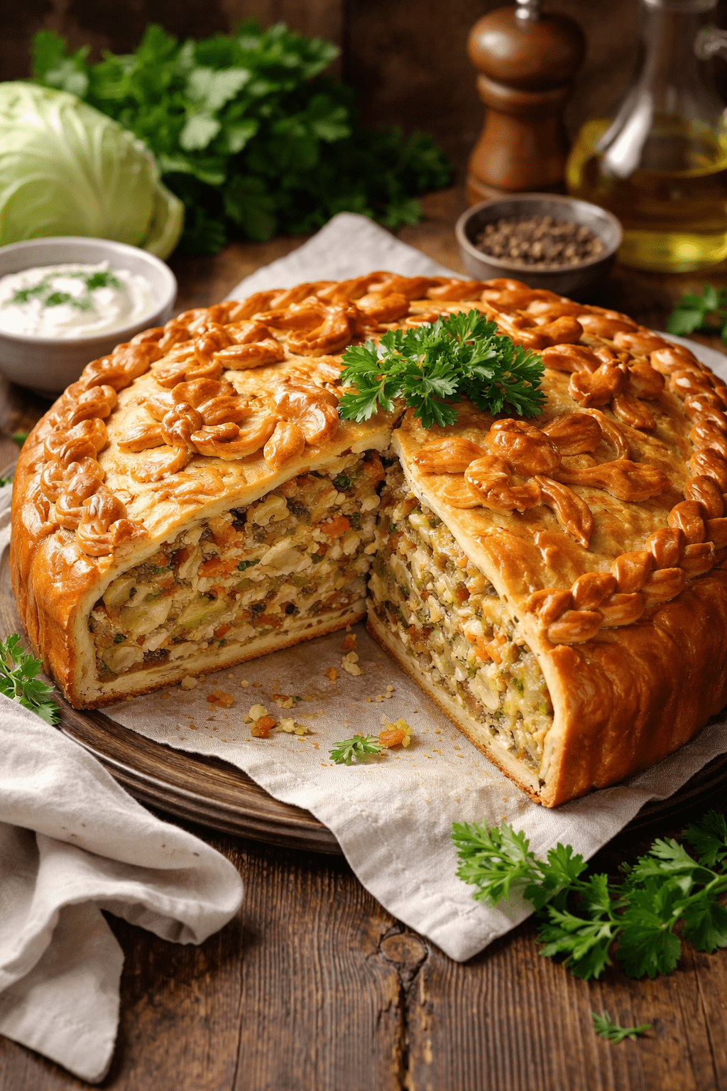 Die Kulebyaka-Torte mit Kohl ist ein klassisches Gericht der russischen Küche – im Grunde eine aufwendig geschichtete, herzhafte Pastete (ähnlich einem gefüllten Strudel oder Pie), die besonders für festliche Anlässe zubereitet wird.