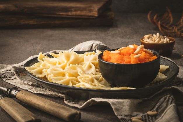 Weichen Kürbis fein pürieren, dabei etwas Kochwasser oder Sahne zugeben, bis eine cremige Konsistenz entsteht. Mit Salz, Pfeffer und Muskat abschmecken.Pasta kochen