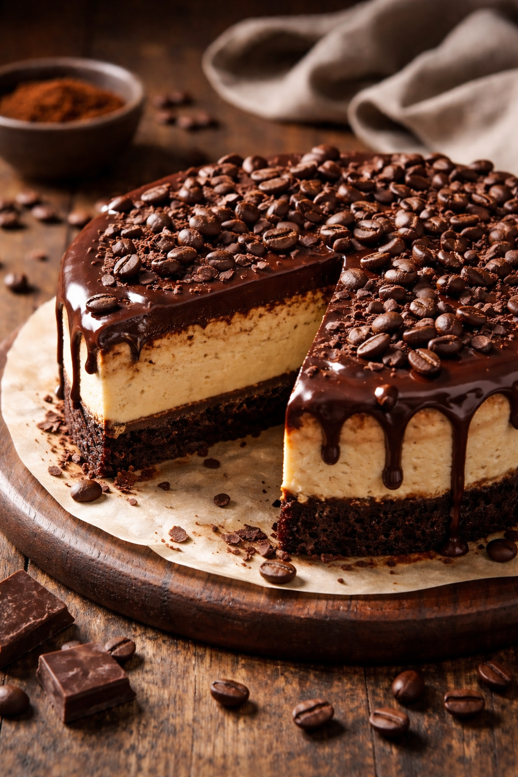 Eine Kombination aus Schokolade, Kaffee und Käsekuchen – ein absolut verführerisches Dessert! 😍 Hier ist eine kleine Übersicht, was so ein Kuchen sein könnte, und wie man ihn macht: